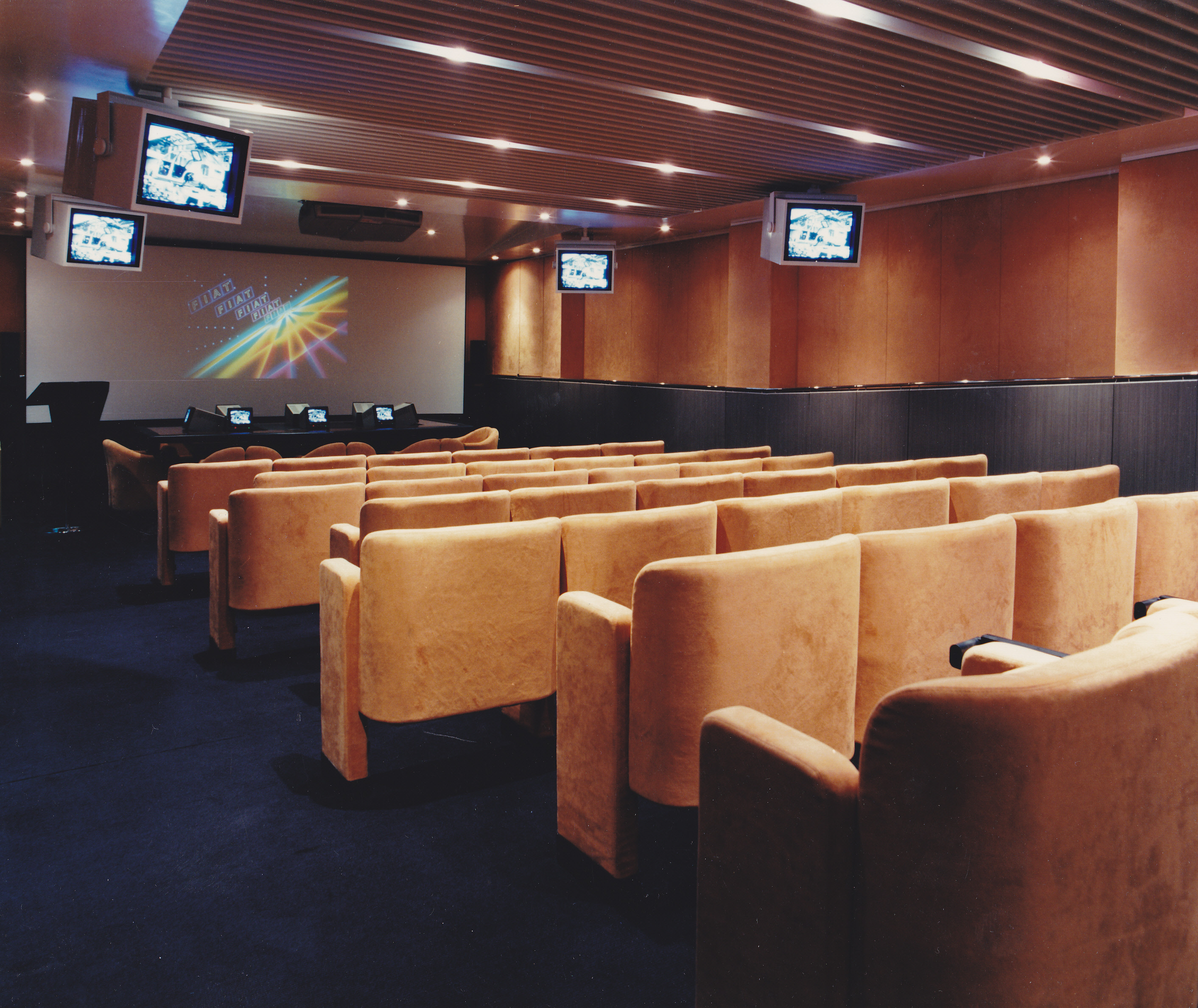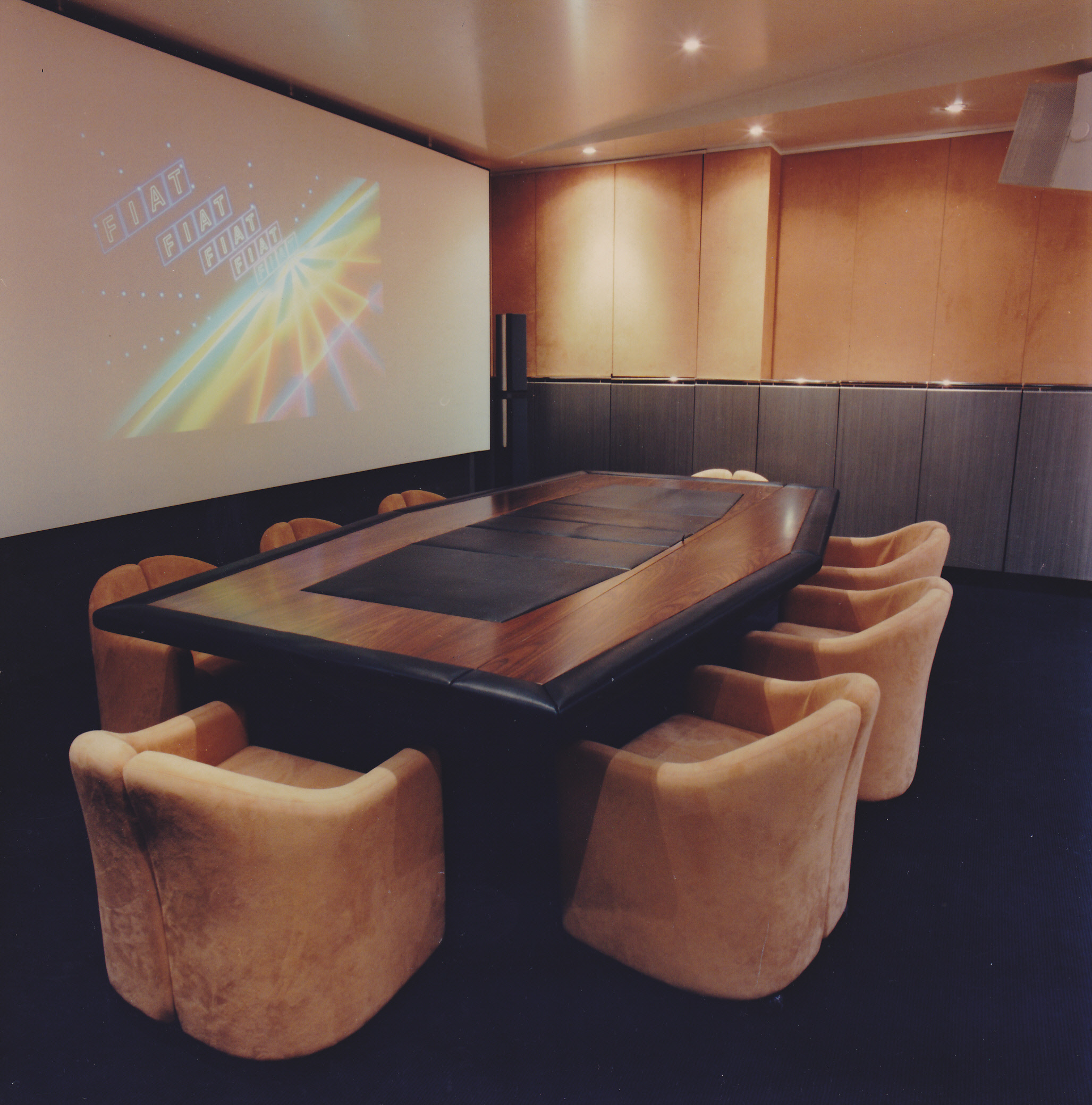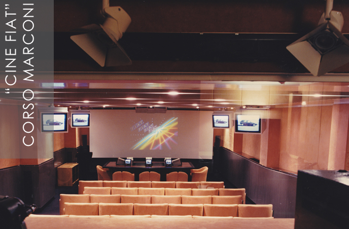 1988-1989, ristrutturazione, arredo e dotazioni impiantistiche generali, trasmissione dati e audiovisive e elettroniche, per sala coferenze, per sala traduzione simultanea e per sala registrazionie e visione, denominata “Cine Fiat”, corso Marconi, Torino, elaborazione studi di progetto, preliminare, arredi, apparecchiatura, impianti, progetto esecutivo, pratiche USL/ASL, VV.F., ecc., gestione e coordinamento realizzazione dei lavori.
